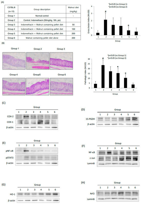 Indomethacin-induced gastric damage model; effect of walnut-containing diet on mitigating indomethacin-induced gastric damage. (A) Schemes for groups: Group 2 is indomethacin-induced gastric damage, Group 3 is indomethacin-induced gastric damage treated with 50 mg/kg walnut-containing diet, Group 4 is indomethacin-induced gastric damage treated with 100 mg/kg walnut-containing diet, Group 5 is indomethacin induced gastric damage treated with 200 mg/kg walnut-containing diet, and Group 6 is rats administered 2000 mg/kg walnut-containing diet only. Gross lesion index was shown according to group. (B) Representational pathological photo according to group. In Group 2, our model showed significant development of erosion, shallow ulcers, and inflammatory cell infiltrations. Mean pathological scores were presented. (C) Western blot for COX-1 and COX-2 in gastric mucosal homogenates according to group. (D) Western blot for COX-1 and COX-2 in gastric mucosal homogenates according to group. (E) Western blot for 15-PGDH in gastric mucosal homogenates according to group. (F) Western blot for p-NF-κB and p-STAT3 in gastric mucosal homogenates according to group. (F) Western blot for NF-κB and c-Jun in nuclear fraction of gastric mucosal homogenates according to group. (G) Western blot for HO-1 in gastric mucosal homogenates according to group. (H) Western blot for Nrf2 in nuclear fraction of gastric mucosal homogenates according to group.