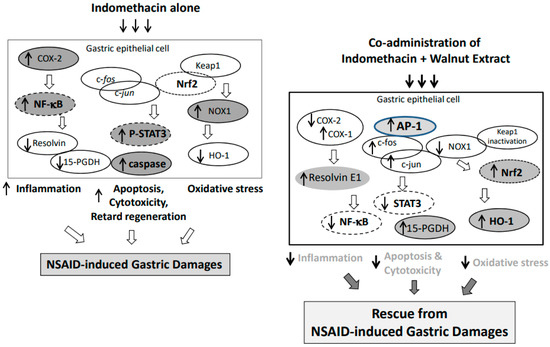Schematic drawing explaining the molecular pathogenesis of indomethacin-induced gastric damage; increased COX-2, increased NF-κB, increased NOX-1, increased STAT3, and increased caspase-3, whereas decreased 15-PGDH, decreased HO-1, decreased RVE1, and retarded the activation of c-Jun/c-Fos relevant to repressed transcriptional activation of gastroprotective 15-PGDH, leading to significant development of indomethacin-induced gastric damage. However, co-administration of indomethacin and walnut significantly reversed these molecular pathogenic events, rescuing from indomethacin-induced gastric damage.