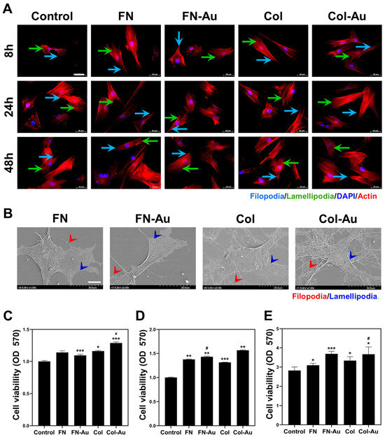 Cell morphology and cell viability analysis. (A) Rhodamine-phalloidin staining for the actin fibers on the control, FN, FN-Au, Col, and Col-Au for 8, 24, and 48 h, respectively. The scale bar is 20 μm. (Blue arrow: filopodia, green arrow: lamellipodia, blue color: nucleus (DAPI staining), red color: actin fiber) Scale bar = 20 μm. (B) SEM images for MSCs on FN, FN-Au, Col, and Col-Au at 48 h. Scale bar = 5 μm (C–E) MSC viability on each material for 24, 48, and 72 h, respectively. All results show significant viability in FN-Au and Col-Au when compared to the control and the two pure substances. * p < 0.05, ** p < 0.01, *** p < 0.001: compared to the control. # p < 0.05: compared to the pure substances (FN and Col).