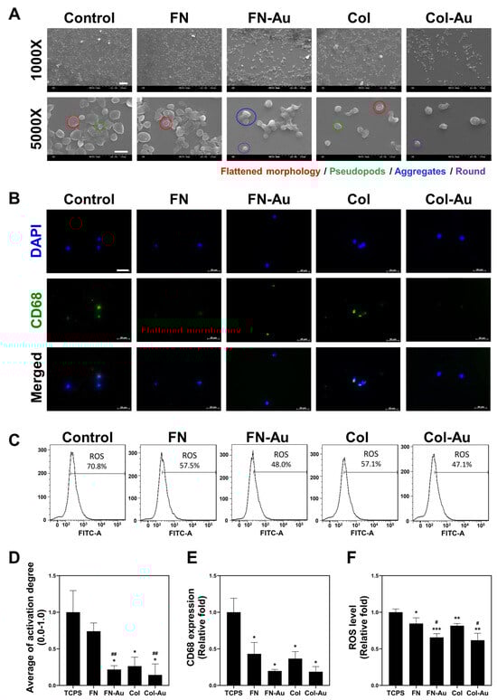 Platelets were cultured on glass coated with FN, FN-Au, Col, or Col-Au in a 24-well plate for one hour. A 2.6% glutaraldehyde/PBS solution was used to fix the platelets, which were then serially dehydrated to observe their activation using SEM (Figure 3A). The platelets showed a flattened shape on the control and the two pure substrates. In contrast, they showed a round shape (inactivated) on the two nanocomposites, with those on the Col-Au nanocomposite only showing a round morphology, indicating that it had the lowest platelet activation. The semi-quantitative results showed apparent platelet activation with the control (TCPS), while the nanocomposites exhibited less activation (Figure 3D). FN, FN-Au, Col, and Col-Au showed 0.74-fold, 0.21-fold, 0.26-fold, and 0.14-fold less activation than the control, and the latter three groups all showed a significant decrease (p < 0.05). Regarding the two nanocomposites, Col-Au had less activation than FN-Au, which is consistent with the SEM images.