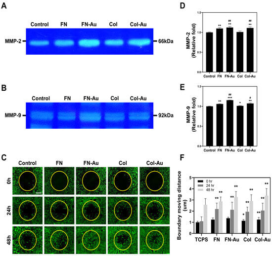 Studies suggested that MMPs are closely related to cell migration since their release from cells induces them to secrete related growth factors. The zymography results (Figure 4A,B) showed that MMP2 and MMP9 expression was significantly higher on FN-Au and Col-Au. The semi-quantitative results (Figure 4D) showed that FN (1.07-fold, p < 0.01), FN-Au (1.23-fold, p < 0.01), and Col-Au (1.21-fold, p < 0.01) had significantly higher MMP2 expression than the control (TCPS) but not Col (1.10-fold, n.s.). Moreover, adding AuNPs induced greater MMP2 expression than the pure substrates (FN-Au, p < 0.01; Col-Au, p < 0.05). Furthermore, MMP9 showed similar trends (Figure 4E): FN (1.06-fold, p < 0.01), FN-Au (1.21-fold, p < 0.001), Col (1.10-fold, p < 0.05), and Col-Au (1.12-fold, p < 0.01). Adding AuNPs again significantly (both p < 0.01) improved MMP9 expression compared to the pure substrates. These zymography results for MMP2 and MMP9 indicate that the nanocomposites can induce greater MMP expression, facilitating cell migration.