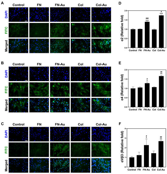 α2, α4, and αVβ3 integrin expression was observed using a fluorescent microscope in each group. The cells were immunostained with α2, α4, and αVβ3 antibodies and then conjugated with FITC-immunoglobulin secondary antibodies (green), and the nucleus was again stained with DAPI (blue). The images were displayed as (A) α2, (B) α4, and (C) αVβ3, respectively. Scale bar = 20 μm. (D–F) The quantified results of α2, α4, and αVβ3 integrin expression, respectively. The results show that α2, α4, and αVβ3 expression are maximum in the FN-Au and Col-Au groups. * p < 0.05, ** p < 0.01, *** p < 0.001: compared to the control. # p < 0.05, ## p < 0.01, ### p < 0.001: compared to the pure substances (FN and Col).