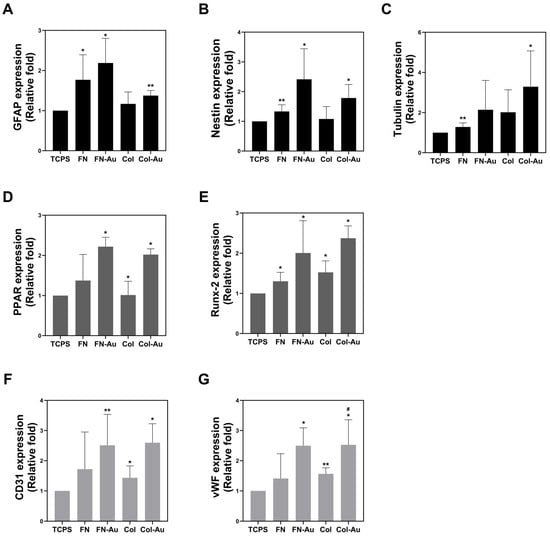 Gene expression of the seven differentiation markers in MSCs was determined via a real-time PCR technique. (A–C) The expression of the GFAP, Nestin, and tubulin neural differentiation markers was semi-quantified. (D) The expression of the PPAR adipocyte differentiation marker was semi-quantified. (E) The expression of the Runx-2 osteoblastic differentiation marker was semi-quantified. (F,G) The expression of vWF and CD31 endothelial differentiation markers was also semi-quantified. * p < 0.05, ** p < 0.01: compared to the control. # p < 0.05: compared to the pure substances (FN and Col).