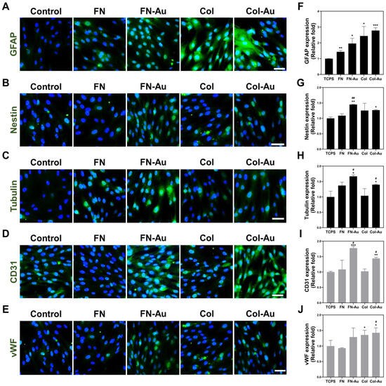 IF staining was performed to confirm the protein expression of the three neural proteins (GFAP, NES, and tubulin) and the two endothelial proteins (CD31 and VWF; Figure 7A–E). Similar to the real-time PCR results, the semi-quantitative data (Figure 7F–J) showed that their protein expression was higher in the FN-Au and Col-Au groups than in the control and pure substrate groups. In addition, their expression was significantly higher in the FN-Au and Col-Au groups than in the control (TCPS) group after seven days (p < 0.05), except for VWF in the FN-Au group (n.s.). These results confirmed the real-time PCR results and indicated that the FN-Au and Col-Au nanocomposites can promote MSC differentiation and proliferation. The fluorescent images and semi-quantitative results for three and five days are shown in Figures S2 and S3.