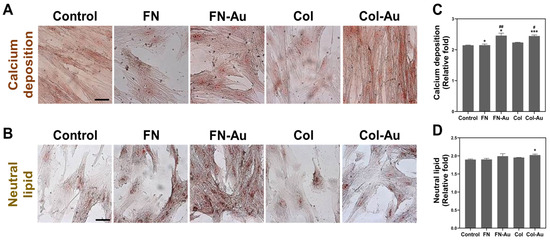 Regarding osteogenic induction, the mineral deposition measured based on ARS staining was significant in the FN-Au and Col-Au groups (Figure 8A). The semi-quantitative data showed that the FN-Au and Col-Au groups had the highest calcium deposition after seven days and were significantly higher than the control and the pure substrate groups (Figure 8C). The FN-Au group differed significantly (p < 0.01) from the FN group and the Col-Au group (p < 0.05). In addition, calcium deposition was significantly higher in the FN-Au and Col-Au groups than in the control, FN, and Col groups at 3, 5, 7, and 10 days, indicating that nanocomposites can indeed improve osteoblastic differentiation (Figure S4A,C).