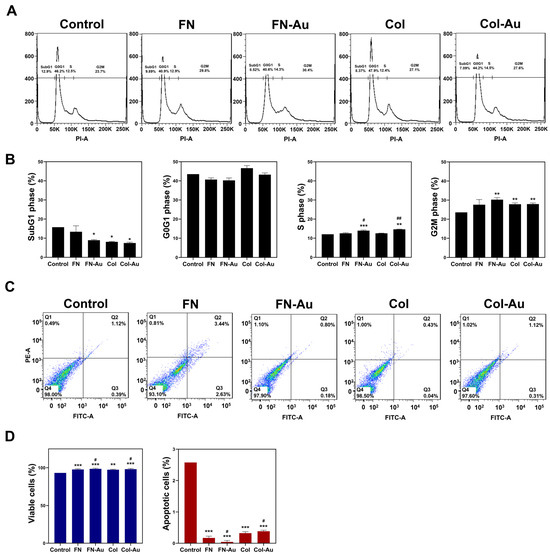 The impact of FN, FN-Au, Col, and Col-Au on the cell cycle in MSCs was investigated using flow cytometry (Figure 9A). As shown in Figure 9B, the population of MSCs in the sub-G1 phase was significantly lower (p < 0.05) in the FN-Au, Col, and Col-Au groups, with the Col-Au group even lower than the pure Col group (n.s.). In contrast, the population of MSCs in the S phase was significantly higher in the FN-Au (p < 0.001) and Col-Au (p < 0.01) groups and differed significantly from the pure substrate groups (FN: p < 0.05; Col: p < 0.01).