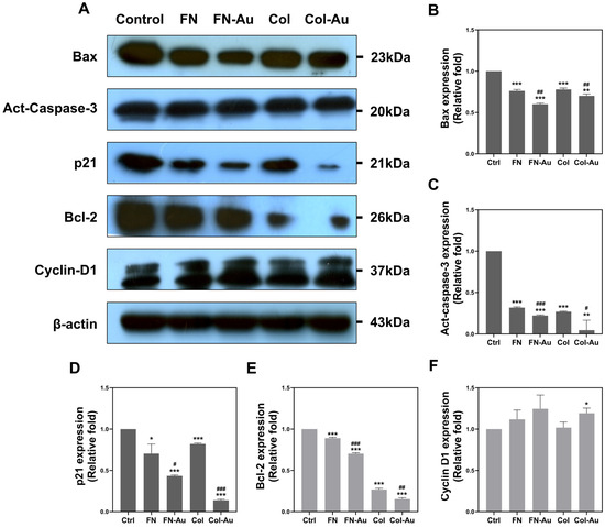 First, cells (2 × 105/well) were seeded into a 10 cm2 cell culture plate and cultured at 37 °C in a 5% CO2 incubator for 48 h to allow them to attach. Next, the cells in each group (TCPS, FN, FN-Au, Col, and Col-Au) were transferred into the centrifuge tubes containing 0.05% trypsin-EDTA (Invitrogen, MA, USA), washed twice with PBS, and then incubated with a cell lysis buffer at 4 °C for 60 min. Finally, the tubes were centrifuged at 13,000 rpm and 4 °C for 20 min, and the supernatant containing the total cellular proteins was collected. Next, the protein concentrations of the samples were determined using bicinchoninic acid (BCA; Bio-Rad, Hercules, CA, USA), which reacts with protein to form a dark purple compound that absorbs light at 595 nm. First, a 0.32 mg/mL bovine serum albumin (BSA) solution was prepared, and BCA was diluted 4:1 with ddH2O. Next, the appropriate amount of BSA was mixed with BCA to prepare 3.2, 1.6, 0.8, 0.4, and 0 µg/mL solutions, which were measured at 595 nm using an ELISA plate reader to construct a standard curve. Note that the ratios of the running gel varied based on the molecular weight. Next, the separated proteins were transferred to a PVDF membrane using a wet Mini Trans-Blot Cell (Bio-Rad, Hercules, CA, USA) with a transfer buffer (Tris-base, glycine, and 100% methanol [J.T. Baker, Stockbridge, GA, USA] in ddH2O) at 4 °C for one hour and then immersed in TBST (Tris-HCl and Tween-20 [J.T. Baker, Stockbridge, GA, USA] with NaCl in ddH2O) containing 5% skimmed milk powder at room temperature with shaking for one hour for blocking. Then, the quantified total proteins were mixed with a loading buffer and separated via SDS-PAGE using the Mini PROTEAN System (Bio-Rad, Hercules, CA, USA) at 80–120 V for about 90–120 min. Next, the separated proteins were transferred to a PVDF membrane using a wet Mini Trans-Blot Cell (Bio-Rad, Hercules, CA, USA) with a transfer buffer (Tris-base, glycine, and 100% methanol [J.T. Baker, Stockbridge, GA, USA] in ddH2O) at 4 °C for one hour and then immersed in TBST (Tris-HCl and Tween-20 [J.T. Baker, Stockbridge, GA, USA] with NaCl in ddH2O) containing 5% skimmed milk powder at room temperature with shaking for one hour for blocking. Then, the membrane was incubated with the primary antibodies against BAX, BCL2, caspase 3, cyclin D1, and p21 (1:1000; Santa Cruz Biotechnology, Santa Cruz, CA. USA) and β-actin (1:5000) in TBST at 4 °C overnight. Next, the membrane was washed four times with TBST (10 min each) before being incubated with the secondary antibodies (1:5000) for one hour. Then, the membrane was washed four times with TBST (10 min each). Finally, the membrane was incubated with the enhanced chemiluminescence (ECL) reagent (PerkinElmer, MA, USA), and the protein bands were observed in a dark room and analyzed using Gel-Pro Analyzer 4.0 software.