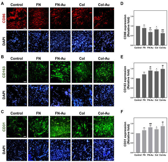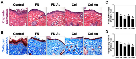The in vivo biocompatibility assessments used 2–3-month-old female SD rats weighing 300–350 g. The study protocol was approved by the Animal Care and Use Committee (approval number La-1071565). The materials (TCPS, FN, FN-Au, Col, and Col-Au) were implanted locally under the dorsal skin through a 10 mm incision under local anesthesia. After one month, capsule formation was observed through H&E staining, and collagen deposition was measured using Masson’s trichrome staining. Macrophage activation was investigated by adding mouse monoclonal anti-CD86 and anti-CD163 antibodies (Cell Signaling, MA, USA) diluted 1:200. Additionally, endothelial differentiation was investigated by adding an anti-CD31 antibody (Santa Cruz Biotechnology, Santa Cruz, CA, USA). These experimental results are presented as the mean ± standard deviation (SD) of five rats.