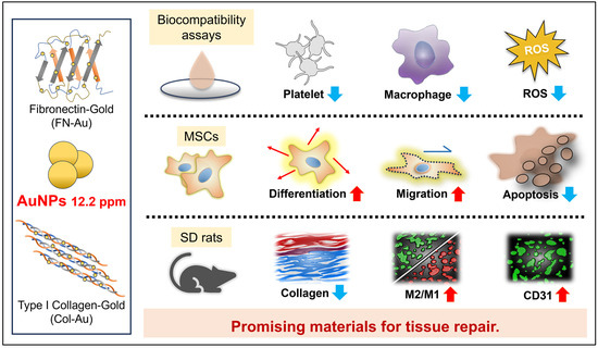 This study intended to provide a functionalized surface coating comprised of AuNPs and FN or Col to improve the biocompatibility and favorable cellular response of MSCs on the nanocomposites. The surface morphology of FN and Col was markedly changed by adding a small amount of AuNPs. The FN-Au and Col-Au nanocomposites exhibited better biocompatibility and biological performance than the pure FN and Col, including promoting cell proliferation, reducing platelet and monocyte activation, and reducing ROS generation. In addition, the FN-Au and Col-Au nanocomposites induced better MSC differentiation, making them promising materials for tissue regeneration.