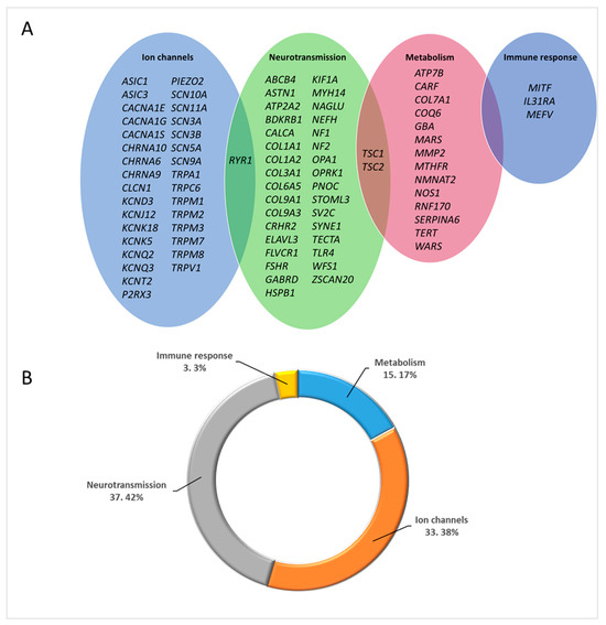 (A) Venn diagram of the 86 genes with VUS variants, categorised into four groups; ‘Ion channels’, ‘Neurotransmission’, ‘Metabolism’ and ‘Immune response’ adopted from Calvo, M; et al. [9]. (B) Percentage distribution of genes with distinct functions.