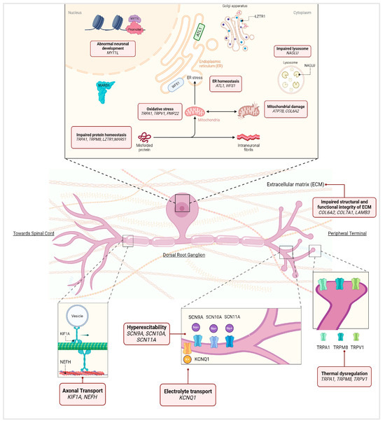 This figure summarizes the genes listed in Table 2, Table 3, Table 4 and Table 5, emphasizing their roles in dorsal root ganglion (DRG) neurons. In particular, it includes pathogenic variants in SCN9A, SCN11A, and WFS1 (previously reported in Table 2); likely pathogenic (LP) variants in ATL1, ATP7B, COL6A2, COL7A1, KCNQ1, LAMB3, LZTR1, MYT1L, PMP22, and SCN10A (Table 3); variants in inherited peripheral neuropathy-related genes ATL1, KIF1A, MARS1, NAGLU, NEFH, PMP22, and SCN9A (Table 4); the top 10 genes with the highest sample count which are SCN9A, TRPA1, ATP7B, SCN10A, COL7A1, WFS1, NAGLU, SCN11A, TRPM8, and TRPV1 (Table 5).