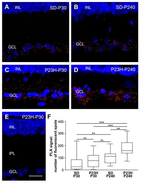Rat retinas from seven animals per age (P30 and P240) and strain (SD and P23H-1) were anesthetized and transcardially perfused according to previously published protocols []. Cryosections from 16 retinas were used for immunocytochemistry and proximity ligation assays. Additionally, 40 retinas were isolated and processed in toto for immunocytochemistry. All animals were anesthetized with a mixture of ketamine (100 mg/kg, Parke-Davis, Alcobendas, Spain) and 2% xylazine (10 mg/kg, Dibapa, Barcelona, Spain) and transcardially perfused with 0.9% saline solution and 4% paraformaldehyde in 0.1 M phosphate buffer (PB). Eyes were dissected and postfixed for 4 h after removing the lens. To obtain retinal sections, eyes were previously cryoprotected in 30% sucrose and frozen with liquid nitrogen. The frozen blocks were stored at −80 °C until use. In addition, whole retinas were isolated after postfixing and stored in a glycerol solution at −20 °C until use.