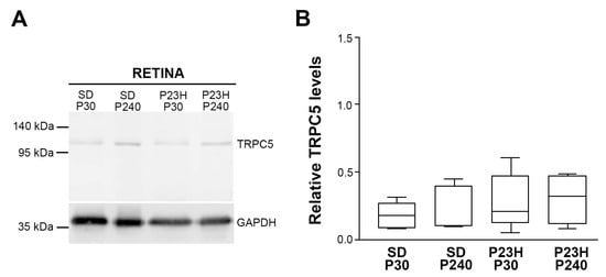 Retinas from at least 5 animals per age (P30 and P240) of each rat strain (SD and P23H) were employed. Retinas were isolated and homogenized in 800 mL of ice-cold commercial RIPA lysis buffer (Sigma-Aldrich) supplemented with a cocktail of protease inhibitors and II phosphatase inhibitor (Sigma-Aldrich) for 30 min at 4 °C and centrifuged at 12,000× g for 15 min at 4 °C. After determining protein concentration, 40 µg of total protein extracts were separated in 10% polyacrylamide gels for over 100 min at 30 mA. The gels were transferred to PVDF membranes (Hybond-C Extra, Amersham Biosciences) using a wet blotter (Bio-Rad, Hercules, CA, USA) for 120 min at 350 mA. The membranes were blocked and were incubated with anti-TRPC5 (see Table 1) in TBST-BSA overnight at 4 °C. A secondary antibody anti-mouse IgG HRP-conjugated 1:2000 (Jackson ImmunoResearch) was used for the detection of TRPC5. Immunoblotting signals were detected with the Luminescent Image Analyzer LAS-mini 4000 system (Fujifilm, Tokyo, Japan). Finally, an anti-GAPDH antibody (Table 1) was used as the loading control. The reaction control included the incubation of membranes without primary antibodies.