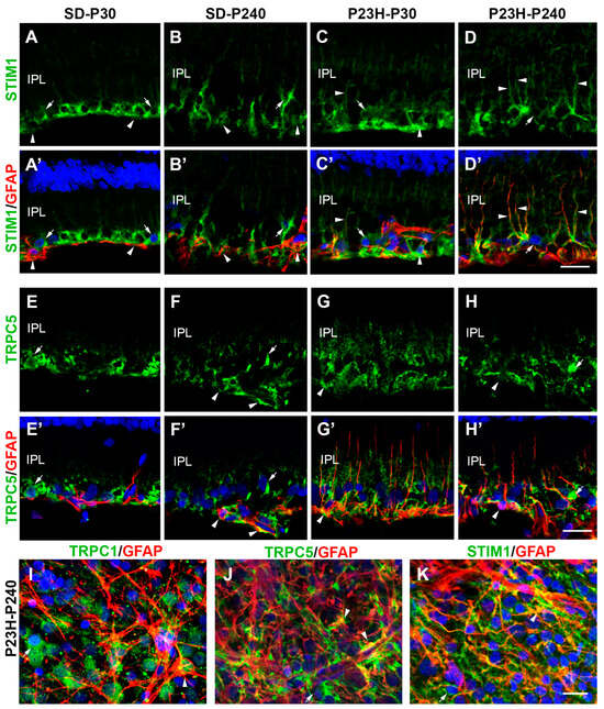 Considering that TRPC1 and TRPC5 channels may gate in a store-dependent manner, which requires other partner proteins, such as STIM, we also seek here specific co-localization between TRPC1 and STIM1 and between TRPC5 and STIM1. First, we identify a specific localization of STIM1 in the inner retina using an anti-GFAP antibody (Figure 4), which is expressed by astrocytes of the normal retina and also by Müller cells in response to degeneration or retinal injury []. In SD and P23H retinas, STIM1 immunoreactivity was distributed throughout the inner retina, occupying astrocytes, Müller cells, and RGCs, with a greater distribution in the Müller cell processes as the retina degenerated (Figure 4A–D’). The STIM1/GFAP co-localization was increasing in degenerating retinas probably because of the gliotic reaction (Figure 4C–D’). Similar results were found analyzing the co-localization between TRPC5 and GFAP (Figure 4E–H’), with co-localization in astrocytes of healthy retinas and with high immunoreaction in Müller cells of P23H retinas at any age analyzed. Moreover, TRPC5 immunoreactive cells in the GCL, which were not immunopositive for GFAP (Figure 4E–F’), correspond to RGCs where TRPC5 also co-localized with TRPC1 (Figure 1). In whole retinas (Figure 4I–K), it was easier to appreciate glial cells immunoreactive for TRPC1, TRPC5, and STIM1 in older P23H retinas. The TRPC1/GFAP co-localization immunoreactivity was previously reported in glial cells of rat retinas [] (Figure 4I and Supplemental Figures S1–S3).