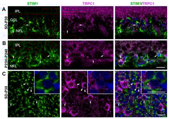 Confocal images showing STIM1 and TRPC1 immunolocalization in retinal sections of the inner retina from SD (A) and P23H (B) rat retinas and in a whole retina from a healthy rat (C). Exceptional co-localization of STIM1/TRPC1 in retinal ganglion cells (arrows and magnification in boxes in (C), asterisk) and STIM1 immunoreactivity around RGCs (arrowheads). Nuclei are stained with DAPI (blue). GCL, ganglion cell layer; IPL, inner plexiform layer; NFL, nerve fiber layer. Scale bar: 20 μm.