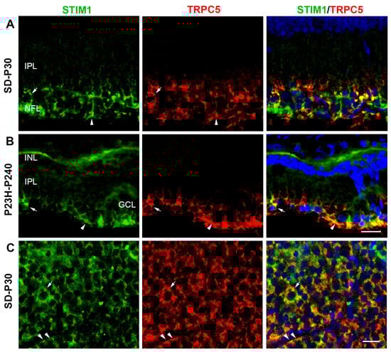 Finally, we looked for possible co-localization of STIM1 with TRPC1 or TRPC5 (Figure 5 and Figure 6). We only occasionally found STIM1 in cells immunolabeled for TRPC1 in the GCL (Figure 5A). These cells had the morphology of RGCs. This distribution pattern is repeated even when the retinas no longer have photoreceptors (Figure 5B). The results of the wholemount retinas analysis indicated that TRPC1 and STIM1 immunoreactivities coexisted, but rarely co-localized, in the cytoplasm of RGCs (Figure 5C). Furthermore, STIM1 was also distributed in glial processes around RGC somata that were immunoreactive to TRPC1. In contrast, there are numerous cells and elements immunoreactive for TRPC5 and STIM1 in the GCL and NFL in all retinas (Figure 6). TRPC5 and STIM1 immunoreactivity were clearly co-localized in RGCs and astrocytes of SD retinas (Figure 6A,C) and in RGCs, astrocytes, and Müller cells of P23H retinas (Figure 6B).