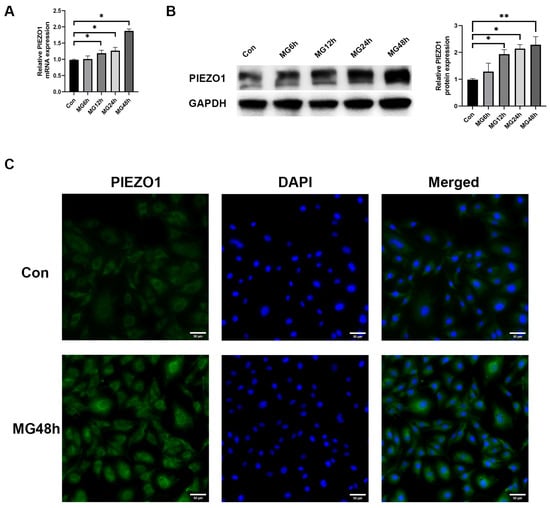 In this study, we conducted an in vitro experiment using HUVECs cultured in clinostat after clinorotation for 6 h, 12 h, 24 h, and 48 h. To identify the effect of simulated microgravity on PIEZO1, qRT-PCR and Western blot were used to measure expression levels of PIEZO1. As observed in Figure 1A, the mRNA level was increased significantly after clinorotation for 12 h, 24 h, and 48 h. As shown in Figure 1B, clinorotation for 12 h, 24 h, and 48 h also increased PIEZO1 expression at the protein level in a time-dependent manner. Compared with the control group, PIEZO1 expression level at the protein and mRNA levels increased gradually with exposure time. Consequently, we chose 48 h as the time point for further analysis due to qRT-PCR and Western blot consistently showing the highest expression level of PIEZO1 at clinorotation for 48 h. Moreover, immunofluorescence demonstrated that the expression of PIEZO1 increased after simulated microgravity (MG) for 48 h, which was consistent with qRT-PCR and Western blot analysis (Figure 1C). The data indicated that PIEZO1 was upregulated in HUVECs under simulated microgravity.