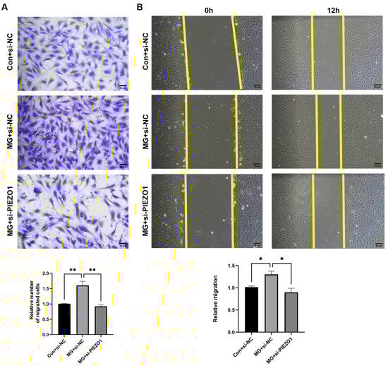 Endothelial cell migration is a crucial process throughout life, including embryogenesis, vessel repair, and angiogenesis [25,26,27]. Our previous study confirmed that clinorotation for 48 h increases HUVEC migration [7]. To investigate whether simulated microgravity promotes endothelial cell migration through PIEZO1, we used PIEZO1 siRNA to knock down PIEZO1 under the clinorotation condition. The interference efficiency of siRNA3 was higher than that of the other two PIEZO1 siRNAs (siRNA1 and siRNA2), which were used in subsequent experiments (Figure S1). A Transwell assay of HUVECs showed that the number of migrated cells in the microgravity group with si-NC treatment (MG+si-NC) was approximately 1.6-fold of the Con+si-NC group. Nevertheless, the si-PIEZO1 treatment reduced the number of migrated cells (Figure 2A). Similarly, compared to the Con+si-NC group, the rate of wound healing in the MG+si-NC group was higher, and si-PIEZO1 treatment under simulated microgravity alleviated HUVECs’ wound-healing ability (Figure 2B). These results suggested that simulated microgravity promotes endothelial cell migration through PIEZO1.