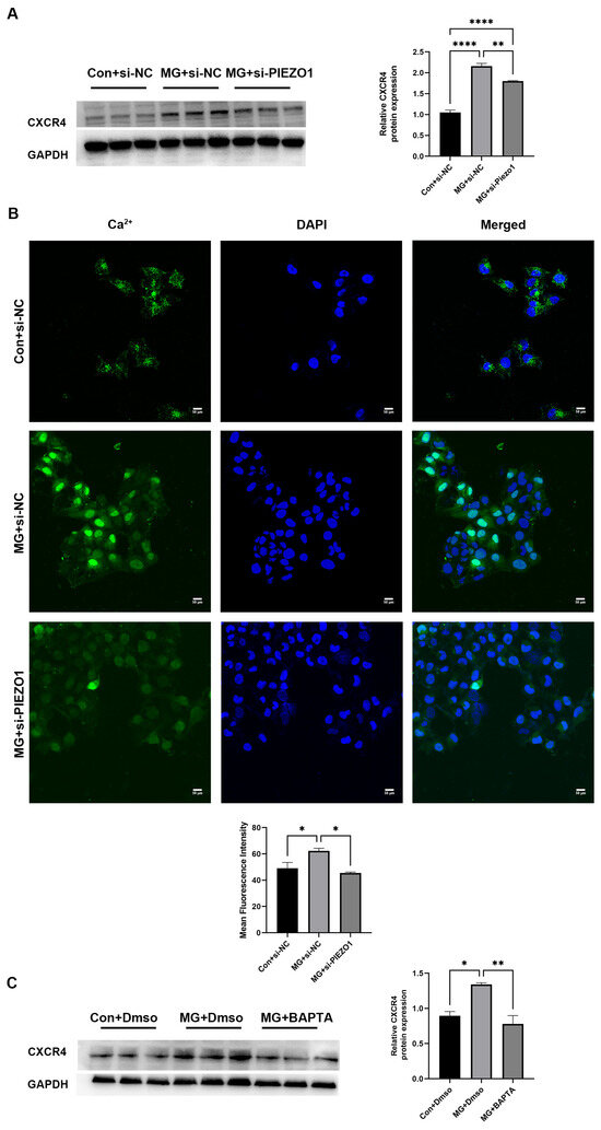 Total protein was extracted from cells using RIPA buffer (NCM Biotech, Suzhou, China) supplemented with 1 mM phosphatase inhibitor cocktail on ice. Protein concentration was measured with the BCA assay (Beyotime, Shanghai, China). The total protein samples were boiled with loading buffer (Bio-Rad, CA, USA) for 10 min. Following this, the samples were subjected to sodium dodecyl sulfate-polyacrylamide gel electrophoresis (SDS-PAGE) separation and then transferred onto a 0.45 μm polyvinylidene fluoride (PVDF) membrane. The membranes were blocked with 5% non-fat milk in a Tris-buffered saline-Tween 20 (TBST) solution at room temperature for 2 h. After blocking, membranes were incubated with the following primary antibodies: anti-PIEZO1 (1:1000, Abcam, Cambridge, UK, ab259949) and CXCR4 (1:1000, Abcam, Cambridge, UK, ab124824) and anti-GAPDH (1:2000, Zhuangzhi Biology, Xian, China, NC021), overnight at 4 °C to allow for antibody binding. The membranes were incubated with horseradish peroxidase (HRP)-conjugated secondary antibody for 1 h at room temperature. Protein bands were detected using an enhanced chemiluminescence (Millipore, Danvers, MA, USA). The band intensity was quantified with ImageJ (https://imagej.nih.gov/ij/index.html, accessed on 25 June 2024) and normalized to GAPDH as a loading control.