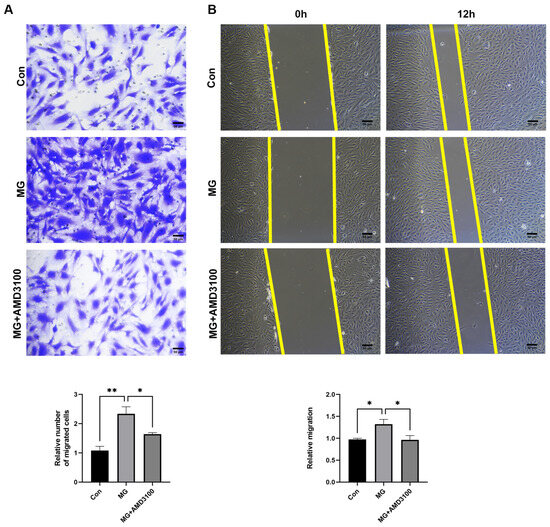 To ascertain whether CXCR4 facilitates cell migration under simulated microgravity, we conducted both Transwell and wound healing assays. We used AMD3100, an inhibitor of CXCR4, to treat HUVECs, which were exposed to simulated microgravity for 48 h. Compared to the control group, the number of migrated cells was increased in the MG group, which was decreased by AMD3100 (Figure 5A). In concordance with the Transwell assay results, wound-healing assays showed that AMD3100 effectively reduced CXCR4-driven cell migration under simulated microgravity (Figure 5B). These data confirmed that CXCR4 promoted the migration of HUVECs under simulated microgravity.