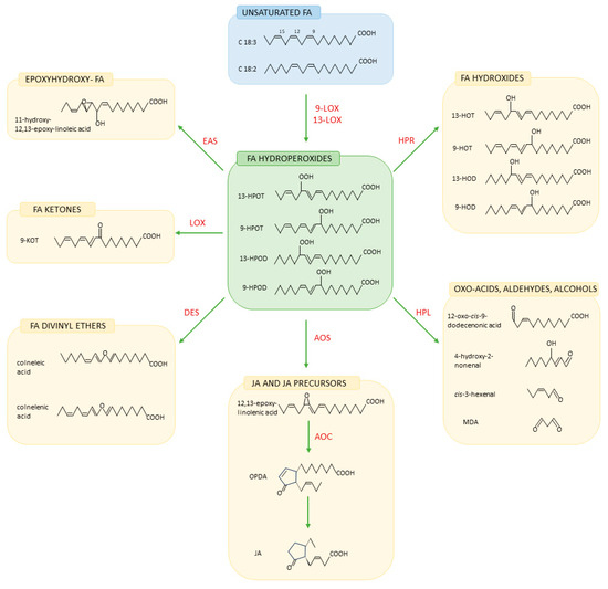 Oxylipin biosynthesis. Abbreviations: LOX: lipoxygenase; HPR: hydroperoxide reductase; HPL: hydroperoxide lyase; AOS: allene oxide cyclase; AOC: allene oxide cyclase; DES: divinyl ether synthase; EAS: epoxy alcohol synthase; FA: fatty acid; 13-HPOT: 13-hydroperoxy octadecatrienoic acid; 9-HPOT: 9-hydroperoxy octadecatrienoic acid; 13-HPOD: 13-hydroperoxy octadecadienoic acid; 9-HPOD: 9-hydroperoxy octadecadienoic acid; 13-HOT: 13-hydroxy octadecatrienoic acid; 9-HOT: 9-hydroxy octadecatrienoic acid; 13-HOD: 13-hydroxy octadecadienoic acid; 9-HOD: 9-hydroxy octadecadienoic acid; MDA: malondialdehyde; OPDA: 12-oxo-phytodienoic acid; JA: jasmonic acid; 9-KOT: 9-keto-octadecatrienoic acid.