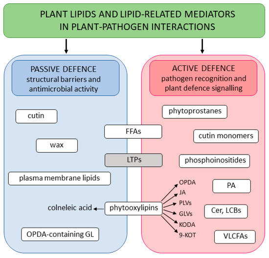 The function of plant lipids and lipid-related mediators in plant–pathogen interactions described in the present work. Abbreviations: OPDA: 12-oxo-phytodienoic acid: GL: galactolipid; FFA: free fatty acid; LTPs: lipid transfer proteins; JA: jasmonic acid; KODA: 9,10-ketol-octadecadienoic acid; 9-KOT: 9-keto-octadecatrienoic acid; Cer: ceramide; LCBs: long chain bases; PA: phosphatidic acid; VLCFAs: very-long-chain fatty acids; GLVs: green leaf volatiles; PLVs: pentyl leaf volatiles.