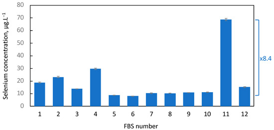 We analyzed selenium concentration in 12 commercial FBS samples from different companies and batches, see Table 1. The method employed here is dedicated to measuring the most abundant selenium isotope (80Se) using triple quadrupole ICP-MS after reaction with oxygen gas. By utilizing this method, we overcome interferences from argon dimers originating from the plasma gas while measuring the most abundant isotope present at 49.61%. Under these conditions, the limits of detection (LOD) and quantification (LOQ) are 0.18 and 0.40 µg.L−1, respectively, for serum samples. With this technology, we achieve relatively low serum concentrations in our samples. As depicted in Figure 2, selenium concentrations in FBS were usually low (average 19.1 ± 16.9 µg.L−1) and characterized by a large inter-batch and inter-supplier variability, with extreme values of 8.14 ± 0.06 µg.L−1 and 68.72 ± 1.01 µg.L−1 (mean ± S.D.) for FBS #6 and FBS #11, respectively. The ratio between these two FBS corresponds to an 8.4-fold change.