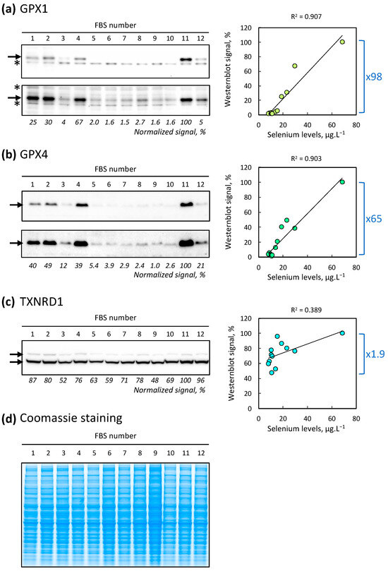 Variation of intracellular selenoprotein expression levels depending on the serum used, visualized via Western blot analysis. HEK293 cells were cultured in the presence of each FBS variant listed in Table 1 and harvested after three days of growth. Cellular extracts were subsequently separated on protein gels and subjected to Western blot analysis to determine the levels of GPX1 (a), GPX4 (b), and TXNRD1 (c). (d) One gel was stained with InstantBlue Coomassie staining solution and used for signal intensity normalization. For GPX1 and GPX4, an additional, more exposed gel is also presented to confirm the presence of signal at a lower level. The arrows indicate the migration of the selenoproteins. Non-specific bands are indicated by stars. The relative protein level intensity is indicated as a percentage of the strongest signal across the entire blot at the bottom of each image. On the right side of each blot, a graph depicting the Western blot signal intensity as a function of serum selenium concentration is displayed. A linear regression line is shown along with its Pearson linear determination coefficient (R2). For each graph, the differences between the lowest and highest values in the Western blot signal are indicated by a blue bracket, with the corresponding fold-change factor beside it.