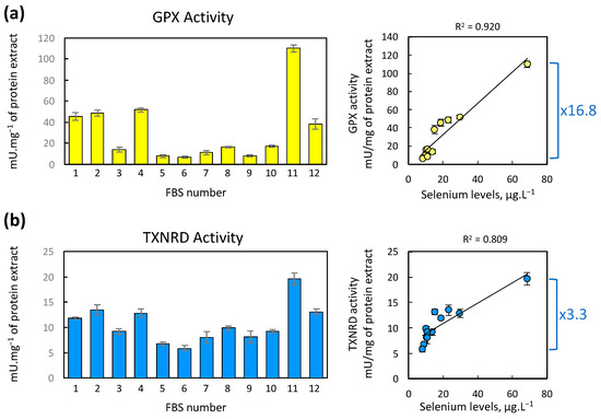 In the present study, the same cellular extracts obtained above were also evaluated for their GPX and TXNRD activities, as shown in Figure 4, panels a and b, respectively. We found that the nature of the FBS stimulates a 16.8-fold change for GPX activity and a 3.3-fold change for TXNRD activity. Furthermore, in both sets of measurements, the ranking of enzymatic activities obtained with the different FBS is nearly identical and closely corresponds to the ranking of selenium concentrations detected by triple quadrupole ICP-MS. In both cases, it is FBS #6 and #11 that yield the lowest and highest values, respectively. To verify the quality of the correlation, we plotted the enzymatic activities as a function of selenium levels in FBS (panels to the right, Figure 4). In both cases, we observed a positive correlation that appears much more apparent with GPX activity than with TXNRD activity, as indicated by the Pearson linear determination coefficient (R2). In other words, GPX activity is highly sensitive to variations in selenium levels in the culture medium and can serve as a precise marker of this variation (R2 = 0.920).
