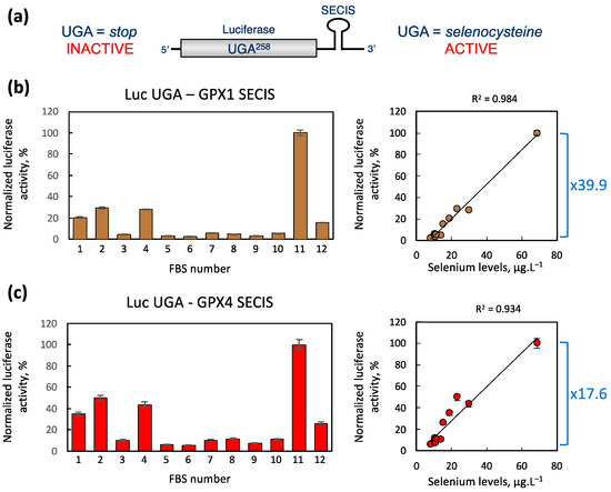 To confirm the correlation between selenoprotein expression and the selenium level in the culture medium, we used a reporter gene system adapted to measure the efficiency of selenocysteine insertion [25,49]. This system was developed and validated to study the translational regulation of selenoproteins in vivo (Figure 5a). The luciferase activity corresponds to the efficiency of UGA recoding into selenocysteine. HEK293 cells stably expressing Luc UGA-minimal selenocysteine insertion sequence (SECIS) GPX1 or Luc UGA-SECIS GPX4 facilitated the direct and rapid evaluation of selenocysteine insertion efficiencies in response to various stimuli, including selenium level variations. Cells were cultured with growth media containing the different FBS, and subsequently, cellular extracts were assayed for luciferase activities, normalized to protein concentrations, and expressed relative to the maximum activity measured, set as 100% (Figure 5b,c).