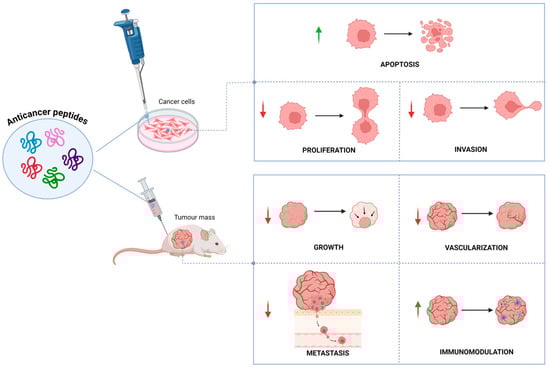 Biological effects of anticancer peptides in vitro and in vivo. Green arrows indicate activation; red arrows indicate inhibition.