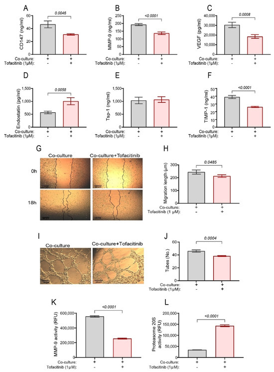 2.1. Tofacitinib Inhibits Angiogenesis in the Co-Culture and Oppositely Regulates MMP-9 and Proteasome 20S Activities