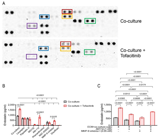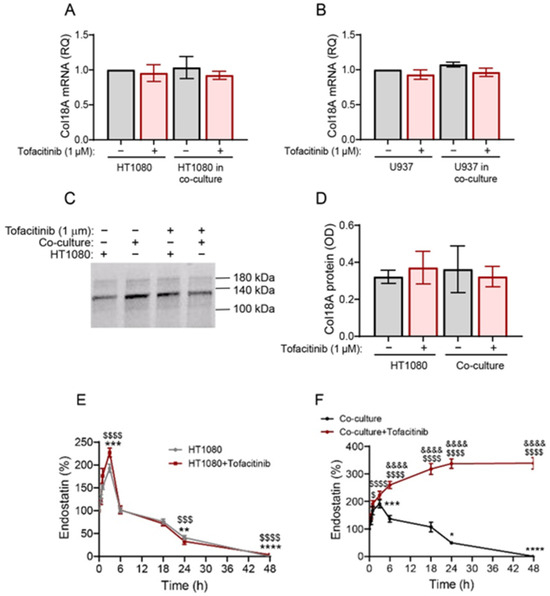 2.5. Tofacitinib Does Not Affect Col18A Transcription or Deposition but Inhibits the Degradation of Endostatin in Co-Cultures