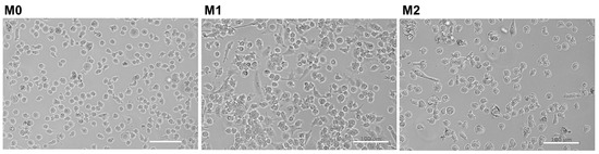 Morphology of THP-1-derived macrophages under different polarization states. Representative images of non-polarized macrophages (M0), pro-inflammatory macrophages (M1) induced with IFN-γ and LPS, and anti-inflammatory macrophages (M2) induced with IL-4 and IL-13 are shown. Cells were observed and imaged using phase contrast microscopy. Scale bar = 100 µm.