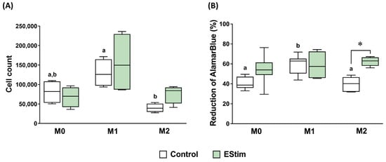 Effect of DC EStim on the number and viability of adherent THP-1-derived M0, M1 (IFN-γ + LPS), and M2 (IL-4 + IL-13) macrophages. Cell count (A) and viability, expressed as the percentage reduction of alamarBlue (B), were measured after priming with PMA (5 ng/mL) for 24 h, followed by a 24 h resting period and a 72 h polarization stage. During the polarization, cells were exposed (or not: control group) 1 h/day to 100 mV/mm of direct current electrical stimulation (EStim group). n = 5 independent experiments, each with 3 technical replicates. *: p < 0.05. Comparisons between control groups are shown with letters, where groups with the same letter are not significantly different.
