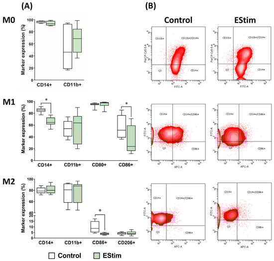 The expression of cell surface markers in THP-1-derived macrophages was analyzed using flow cytometry (Figure 3 and Supplementary Figures S1 and S2). The percentage of CD14+ and CD86+ cells was significantly lower in the M1 group exposed to EStim during polarization (p < 0.05) compared to its control, whereas no differences in CD11b+ and CD80+ cells were detected. In M0 cells, EStim did not produce any changes in the percentage of CD14+ and CD11b+ cells. The expressions of CD14, CD11b, and CD206 were not affected by the EStim treatment in M2 cells.