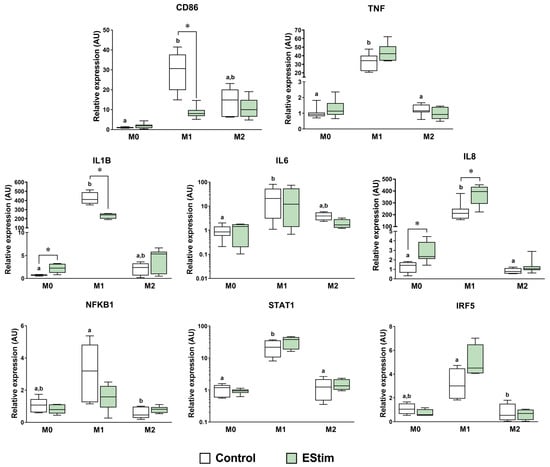 Gene expressions of M1-related markers and signaling mediators assessed using RT-qPCR in adherent THP-1-derived M0, M1 (IFN-γ + LPS), and M2 (IL-4 + IL-13) macrophages. Cells were primed with PMA (5 ng/mL) for 24 h, followed by a 24 h resting period and a 72 h polarization stage. During polarization, cells were treated (or not: control group) 1 h per day with 100 mV/mm of direct current electrical stimulation (EStim group). n = 5 independent experiments, each with 3 technical replicates. *: p < 0.05. Comparisons between control groups are shown with letters, where groups with the same letter are not significantly different.
