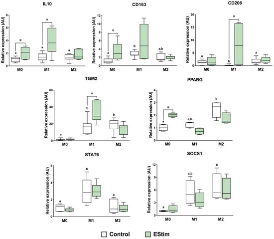 Gene expressions of M2-related markers and signaling mediators assessed using RT-qPCR in adherent THP-1-derived M0, M1 (IFN-γ + LPS), and M2 (IL-4 + IL-13) macrophages. Cells were primed with PMA (5 ng/mL) for 24 h, followed by a 24 h resting period and a 72 h polarization stage. During polarization, cells were treated (or not: control group) 1 h per day with 100 mV/mm of direct current electrical stimulation (EStim group). n = 5 independent experiments, each with 3 technical replicates. *: p < 0.05. Comparisons between control groups are shown with letters, where groups with the same letter are not significantly different.
