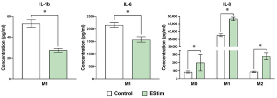 To assess the potential influence of DC EStim on the macrophage secretome in vitro, we measured cytokine concentrations in the cell supernatant. The IL-1β and IL-6 levels were reduced in the M1 EStim group, and the IL-8 concentration showed higher values in all the groups exposed to EStim (p < 0.05) compared to their respective controls (Figure 6). TNF secretion increased with LPS/IFN-γ treatment, but there were no significant differences in this parameter between M1 control (169.11 ± 8.18 pg/mL) and M1 EStim (174.16 ± 6.06 pg/mL) cells.