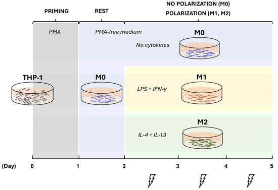 To prime THP-1 cells into macrophage-like cells, 7 × 105 THP-1 cells in 2 mL of GM were seeded into a well of a 6-well plate (TPP, Trasadingen, Switzerland) and cultured for 24 h in the presence of 5 ng/mL phorbol 12-myristate 13-acetate (PMA, Sigma-Aldrich, Taufkirchen, Germany) (Figure 7). This concentration was found to be sufficient to induce stable differentiation without undesirable gene upregulation [60]. Following incubation, the medium and non-adherent cells were completely removed, and adherent cells were washed twice with sterile PBS without Ca2+Mg2+. A total of 2 mL of fresh GM were added to each well, and after a resting period of 24 h, the cells in the M1 and M2 groups (control and experimental groups) were polarized by incubation for 72 h in GM supplemented with 20 ng/mL IFN-γ (R&D Systems, Minneapolis, MN, USA) and 100 ng/mL LPS (Cat Num L2630, Sigma-Aldrich, Taufkirchen, Germany) or 20 ng/mL IL-4 and 20 ng/mL IL-13 (both from R&D Systems, Minneapolis, MN, USA), respectively. Cells in the M0 control and experimental groups were cultured in GM for 72 h without any polarizing agent [28,29,61]. Polarized cells were observed, and phase contrast images were captured using an Axioobserver Z1 microscope (Zeiss, Gottingen, Germany). The timing of the priming and resting periods prior to cytokine exposure was optimized by testing the combinations of 24−48, 48−24, and 24−24 h, respectively. The latter showed higher percentages of CD14+ (97%) and CD11b+ (85%) cells.
