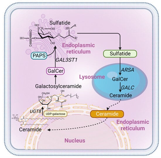 Schematic overview of sulfatide metabolism. Sulfatide synthesis begins in the endoplasmic reticulum with the addition of galactose from UDP-galactose (UDP-Gal) to ceramide by the enzyme ceramide galactosyltransferase (CGT)/UGT8, forming galactosylceramide (GalCer). GalCer is then transported to the Golgi apparatus, where 3′O-sulfation of galactose takes place, catalyzed by cerebroside sulfotransferase (CST)/GAL3ST1. Sulfatide degradation takes place in the lysosomes, where arylsulfatase A (ARSA) removes the sulfate group and galactocerebrosidase (GALC) hydrolyzes GalCer to ceramide. A complete cycle of sulfatide metabolism is depicted with solid lines, while the beginning of synthesis and the end of degradation, marked by the recycling transport of ceramide, are illustrated with dashed lines.