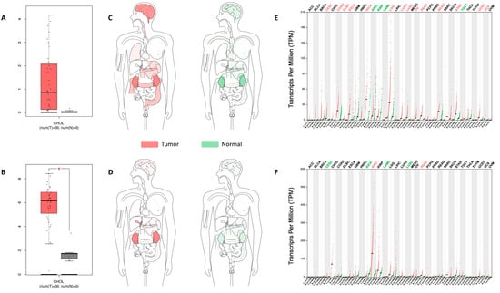 The expression body map, normalized to transcripts per million (TPM) revealed the median expression of UGT8 and GAL3ST1 in different human cancers. UGT8 showed values of 0.8 in CCA and 0.01 in normal tissues; however, GAL3ST1 reached values of 70.6 in CCA and 2.3 in normal tissue (Figure 2C–F). GAL3ST1 showed the highest expression levels in kidney cancer (label: KIRC) and CCA (label: CHOL); so, GAL3ST1 may be involved in the pathophysiology of CCA. However, this up-regulation in CCA is not correlated with lower survival in patients with CCA (Figure S1C).