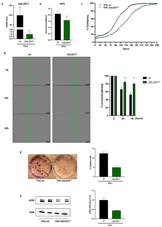 Effect of GAL3ST1 deficiency on cell proliferation of TFK1 cells. (A) Relative mRNA levels of GAL3ST1 and (B) MTS assay in TFK1 wt and GAL3ST1−/− cells; n = 4. (C) Cell proliferation analysis of TFK1 wt and GAL3ST1−/− cells assessed by live-cell imaging; n = 10. (D) Wound Healing assay in TFK1 wt and GAL3ST1−/− cells; n = 6. (E) Colony formation assay of TFK1 wt and GAL3ST1−/− cells; n = 2. (F) Western blot analysis of phospho-ERK1/2 (p-ERK1/2) and total ERK (tERK) in TFK1 wt and GAL3ST1−/− cells. Data are shown as mean ± SD. * p < 0.05, ** p < 0.01, and *** p < 0.001 vs. TFK1 wt cell.
