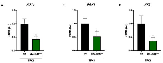 Hypoxia is a common feature in solid tumors and enhances tumor aggressiveness by increasing glycolytic activity in tumor cells through the activation of the hypoxia-inducible factor 1α (HIF1α) pathway [20,21]. GAL3ST1-deficient cells displayed lower mRNA expression of HIF1α (Figure 4A), and glycolytic enzymes phosphoglycerate kinase 1 (PGK1) and hexokinase-2 (HK2) relative to TFK1 wt cells (Figure 4B,C).
