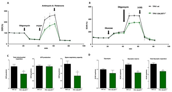 TFK1 GAL3ST1−/− cells showed reduced OCR values compared to TFK1 wt cells under basal conditions (Figure 5C); however, they showed the same relative reduction in OCR values in response to the ATP synthase inhibitor oligomycin (Figure 5A,C). Based on these results, ATP production and the membrane proton leak are not affected by the absence of GAL3ST1 in TFK1 cells. In contrast, after the addition of the protonophore uncoupler FCCP, the maximal OCR activity was significantly lower (≈60% of TFK1 wt cells) in TFK1 GAL3ST1−/− cells (Figure 5A,C). This indicates that the OCR associated with ATP synthesis is not different in TFK1 GAL3ST1−/− cells, while the spare respiratory capacity in these cells was significantly lower than in TFK1 wt cells. In addition, OCR activity was similar in TFK1 wt and KO cells after Antimycin A/Rotenone injection (Figure 5A). Similarly, ECAR was not different between TFK1 GAL3ST1−/− and TFK1 wt cells under basal conditions but was significantly reduced in the KO cells under conditions that stimulated anaerobic glycolysis (viz. oligomycin treatment) (Figure 5B). ECAR was repressed to similar levels in TFK1 wt and KO cells after exposure to 2-DG, a competitive inhibitor of glucose (Figure 5B). This was associated with a reduction in the glycolytic capacity and glycolytic reserve in TFK1 GAL3ST1−/− cells (Figure 5D). The combined results indicate a lower glycolytic and mitochondrial oxidative phosphorylation capacity in TFK1 GAL3ST1−/− relative to TFK1 wt cells.