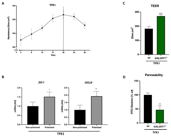 GAL3ST1 deficiency improves barrier function in polarized TFK1 cells. (A) Transepithelial electrical resistance (TEER) values during the polarization process in TFK1 wt cells; (B) relative mRNA levels of tight junction markers ZO-1 and OCLN in TFK1 polarized cells cultured for 20 days; (C) TEER values at day 20 of the differentiation process in TFK1 wt and GAL3ST1−/− cells; and (D) FITC-dextran fluorescence intensity in basolateral medium (expressed relative to wt cells). n = 4. Data are shown as mean ± SD. * p < 0.05, ** p < 0.01, and *** p < 0.001 vs. TFK1 wt cells.