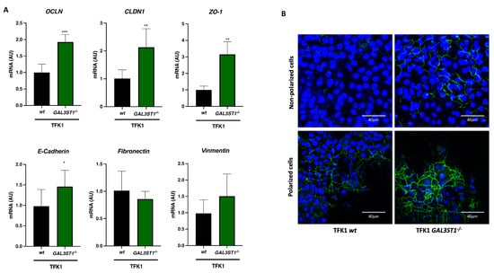 Effect of GAL3ST1 deficiency on epithelial–mesenchymal transition (EMT) in TFK1 cells. Relative mRNA levels of (A) epithelial (OCLN, CLDN1, ZO-1, and E-Cadherin) and mesenchymal (fibronectin and vimentin) markers in TFK1 wt and GAL3ST1−/− cells and (B) anti-ZO-1 immunofluorescent staining of nonpolarized and polarized TFK1 wt and GAL3ST1−/− cells; n = 4. Data are shown as mean ± SD. * p < 0.05, ** p < 0.01 and *** p < 0.001 vs. TFK1 wt cells.