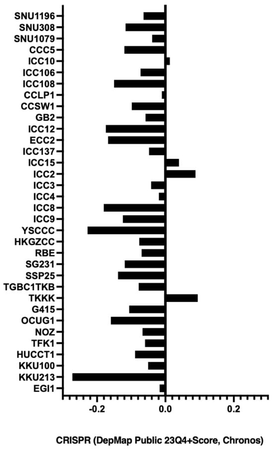 To extend and validate the findings based on TFK1 cells, we used the DepMap database (https://depmap.org/portal/, accessed on 15 May 2024), which is based on CRISPR loss-of-function screens in tumor cell lines. Hereto, we used the 23Q4 public data release from the DepMap at the Broad Institute, consisting of dependency data for 17,386 genes across 1086 cancer cell lines. We analyzed dependency on GAL3ST1 for growth in all 34 available CCA cell lines, which showed a negative score in 30 CCA cell lines (Table S2). A more negative score means a greater cell line dependence for GAL3ST1 (Figure 8). These data reinforce the idea of GAL3ST1 as a new therapeutic target in CCA.