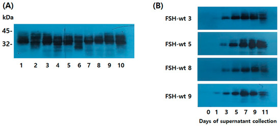 Western blotting analysis of rec-eel FSH-wt proteins produced from single cells. Supernatants from 10 colonies were collected on the day of cultivation in a shaking incubator. The supernatants were resolved by sodium dodecyl sulfate-polyacrylamide gel electrophoresis and blotted onto membranes. Proteins were detected using a monoclonal antibody (anti-eel FSH5A14) and horseradish peroxidase-conjugated goat anti-mouse IgG antibodies. (A) In total, 20 µL of the supernatant on day 9 was loaded in the wells. Numbers denote isolated clone counts. (B) Colonies with substantial secretion were selected for Western blot analyses. We choose four colonies (eel FSH-wt 3, FSH-wt 5, FSH-wt 8, and FSH-wt 9) and 20 µL of supernatant was evaluated by Western blotting on the day of culture. FSH, follicle-stimulating hormone.