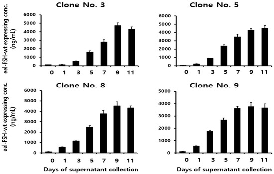 Concentrations of rec-eel FSH-wt proteins secreted from CHO-DG44 cells on the day of culture. The supernatant was collected on days 0, 1, 3, 5, 9, and 11 of culture. The expression levels of rec-eel FSH-wt protein in monoclonal cells were analyzed using a sandwich enzyme-linked immunosorbent assay. Values are expressed as the mean ± standard error of mean from at least three independent experiments. FSH, follicle-stimulating hormone.